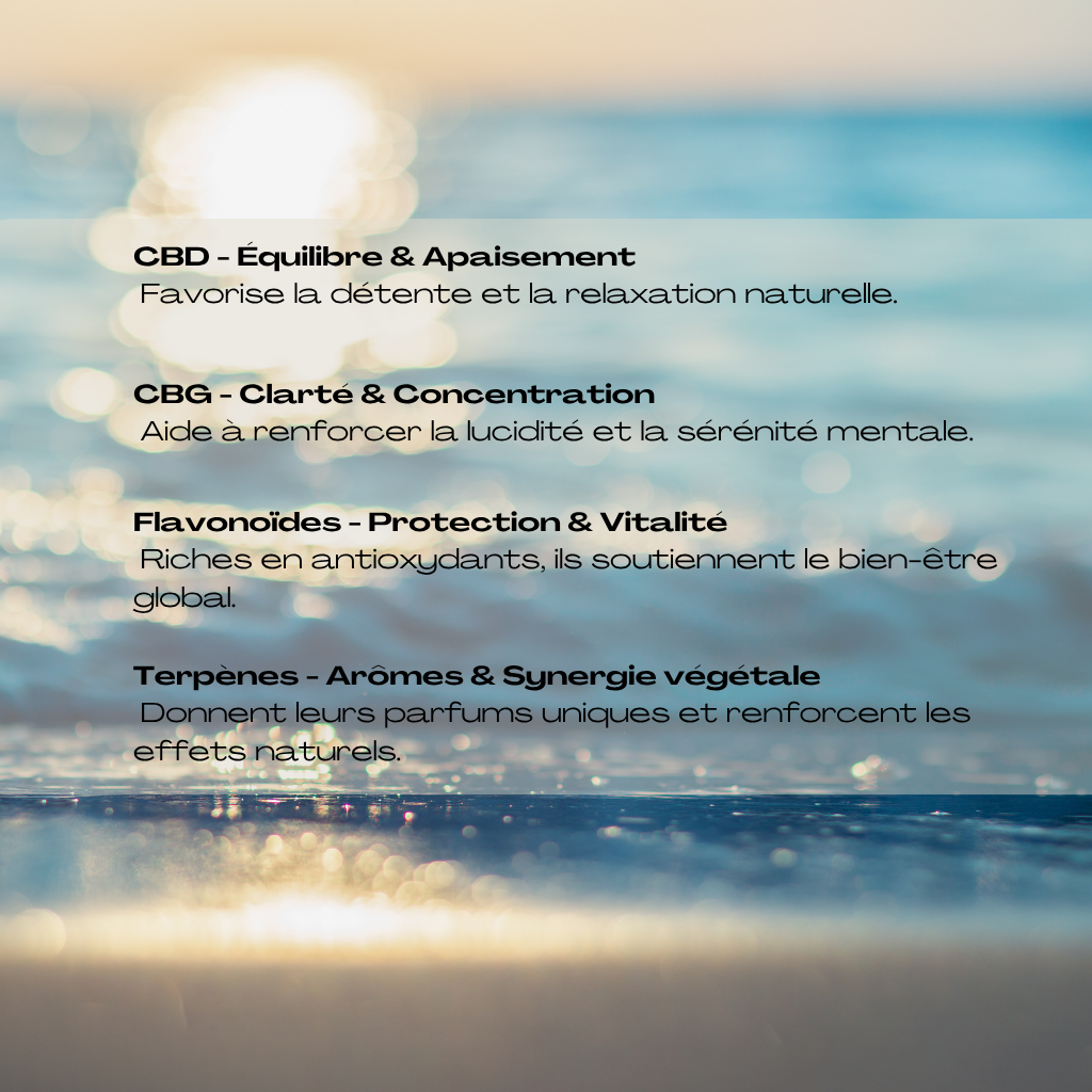 PensĂ© pour le quotidien, notre CBD vous aide Ă retrouver calme et harmonie intĂ©rieure, Ă traverser les pĂ©riodes de tension avec plus de lĂ©gĂšretĂ© et Ă prĂ©server votre Ă©quilibre. Le CBD est apprĂ©ciĂ© pour ses propriĂ©tĂ©s naturelles, souvent associĂ©es Ă des instants de dĂ©tente et de bien-ĂȘtre, tout en restant doux et enveloppant.